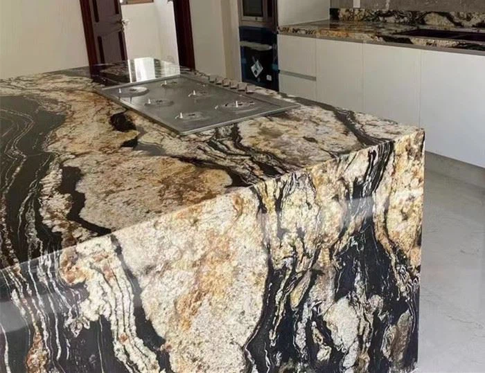 Granit Magma Black mempunyai latar belakang hitam dengan tompok-tompok indah dan urat emas, kuning, oren dan coklat yang mengalir melalui batu. Ia akan menjadi titik tumpuan mana-mana kawasan di rumah anda. Batu semula jadi yang unik dan luar biasa ini sesuai untuk meja dapur, bahagian atas meja solek bilik mandi, percikan belakang dan pelbagai permukaan rumah yang lain.